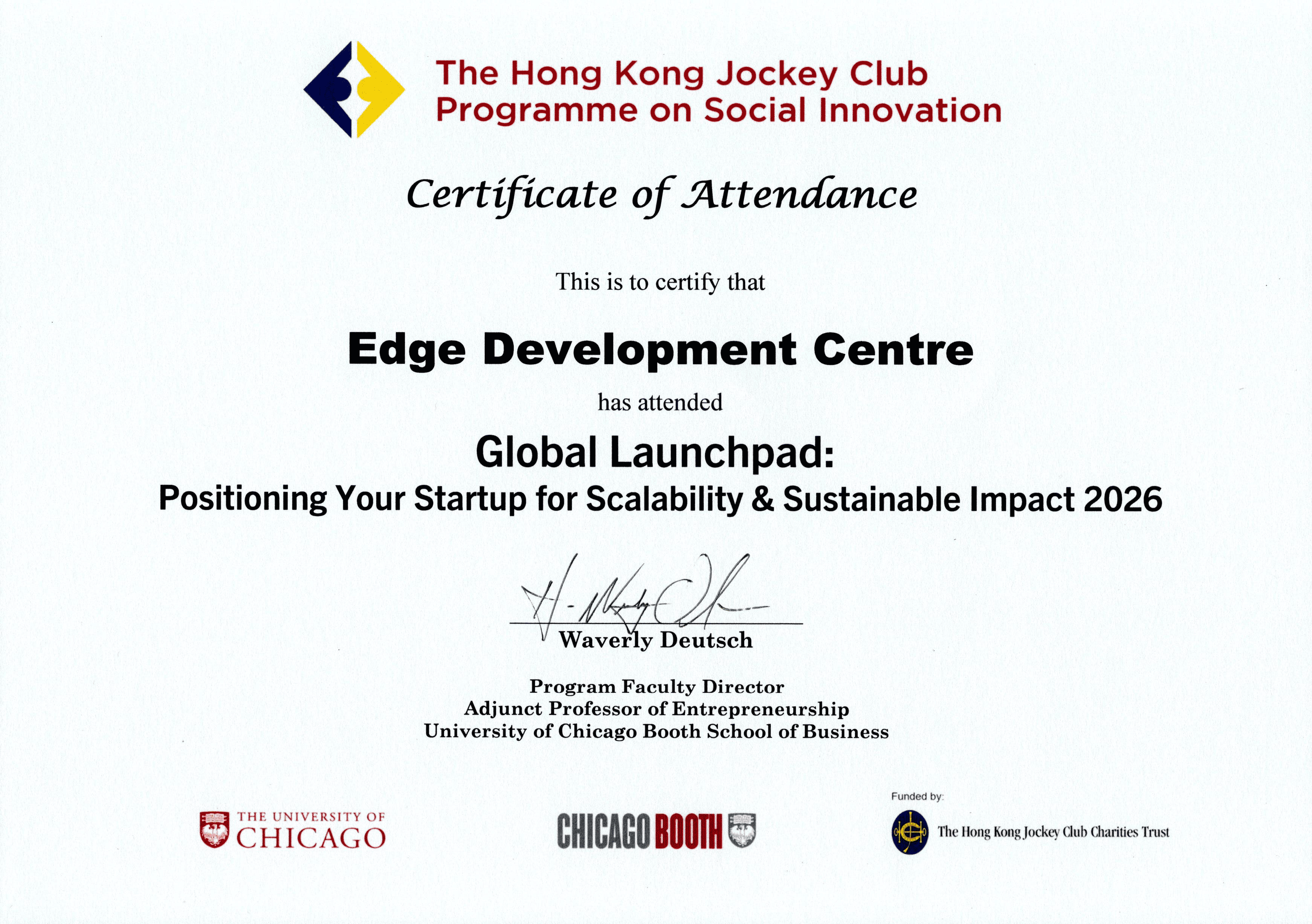 - Edge Development Centre 榮幸受邀參與由香港賽馬會慈善信託基金支持、芝加哥大學布斯商學院舉辦的「Global Launchpad 2026」。本計劃專為初創社企打造,透過結合學術理論與實務指導,助力創業者實現規模化發展與永續影響力。我們將積極把在計劃中所學的專業知識與工具轉化為實際行動,針對社會需求提供創新方案,為香港的社會發展與大眾福祉作出實質貢獻。