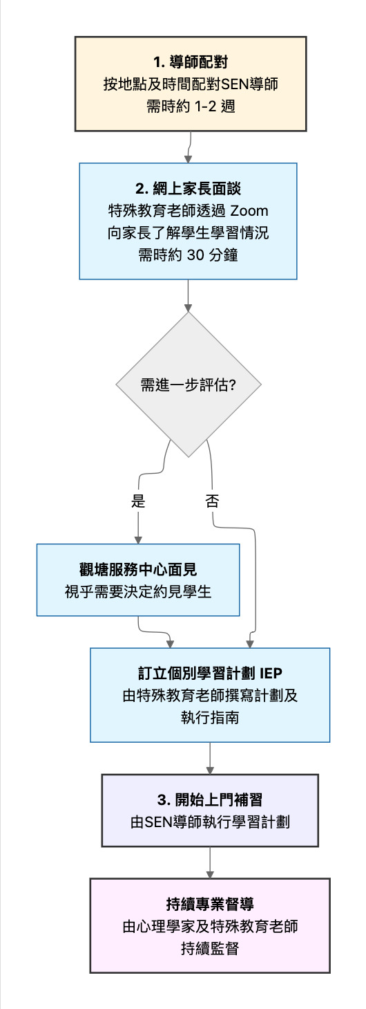註四:我們深諳穩定的恆常安排對有SEN學生的學習甚有益處,因此我們會盡力確保服務的穩定性。然而,在實際服務推展過程中,我們或會因應實際情況(包括但不限於上課時間或地點的調整、導師個人因素等)而相應調整導師安排。